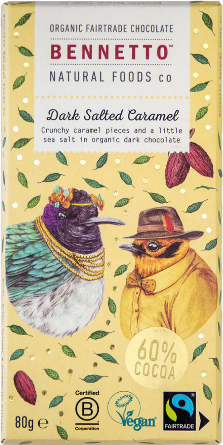 Smooth 60% dark chocolate meets crunchy caramel brittle and a touch of sea salt for a perfectly balanced bite. Certified organic and Fairtrade, this bar is crafted from cocoa beans grown by the UNOCACE Fortaleza cooperatives in Ecuador—supporting farmer livelihoods and community wellbeing. Partnering with Swiss chocolate makers, Bennetto offsets all CO₂ from production by planting timber trees in growing regions, making each bar net climate positive.